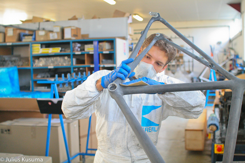 After the layups are all applied, it's time to "finish" the frames before they are sent to the paint station. These guys are very careful in watching for any possible defects.